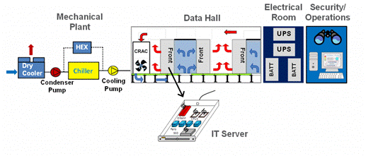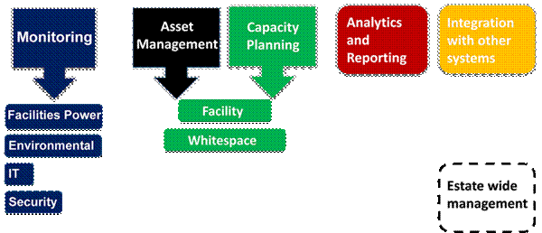 圖1顯示了數(shù)據(jù)中心的主要DCIM領(lǐng)域,從發(fā)電機(jī)、電力室、數(shù)據(jù)大廳和IT設(shè)備,另外還配置了集安全性和一體化的樓宇管理系統(tǒng)(BMS)。DCIM系統(tǒng)可以對(duì)數(shù)據(jù)中心區(qū)域提供監(jiān)控和管理服務(wù)。