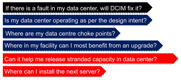 沒有人可以準(zhǔn)確定義描述DCIM或DCIM應(yīng)該做些什么。而一個(gè)錯(cuò)誤的假設(shè)是,DCIM將修復(fù)你的數(shù)據(jù)中心,因此在圖5中的第一個(gè)問題是DCIM產(chǎn)品在市場(chǎng)上的虛假陳述的問題?,F(xiàn)實(shí)情況是,DCIM的一個(gè)最基本的功能應(yīng)該是對(duì)于基礎(chǔ)架構(gòu)的性能和需要關(guān)注的突出問題提供一個(gè)更為深刻的見解,并解決重大風(fēng)險(xiǎn)。最值得注意的是,這些領(lǐng)域包括數(shù)據(jù)中心是否在設(shè)計(jì)意圖實(shí)施,基礎(chǔ)設(shè)施的容量限制(“瓶頸點(diǎn)”),資本項(xiàng)目的評(píng)估,確定閑置的容量,并為下一次部署的服務(wù)器分配一個(gè)合適的位置。