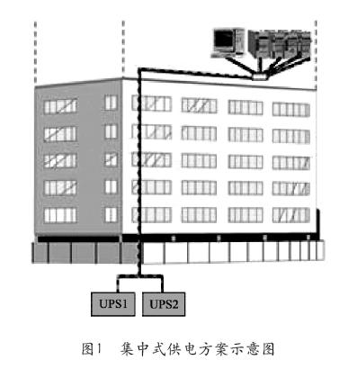 由一臺(tái)UPS組成單機(jī)供電系統(tǒng)、多臺(tái)UPS組成并聯(lián)供電或雙總線供電系統(tǒng),再通過配電集中給負(fù)載供電,這種供電方案一般情況下UPS系統(tǒng)與機(jī)房用電設(shè)備是分開的。該供電方案一般UPS的單機(jī)容量在200~400kVA較多,供電示意圖如圖1所示。
