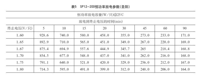 現(xiàn)以圣陽(yáng)閥控鉛酸蓄電池產(chǎn)品SP12-200為例,按恒功率放電特性選擇蓄電池。查SP12-200恒功率放電參數(shù)表(見(jiàn)表5)可知,放電20min,終止電壓為1.67V/只時(shí)的功率為444.9W。