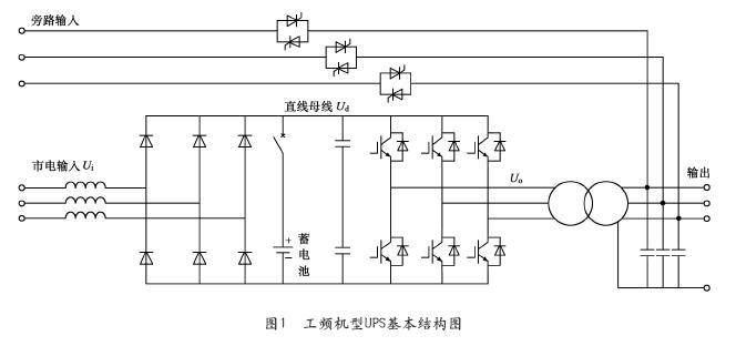 UPS可以分為工頻機(jī)和高頻機(jī)。傳統(tǒng)的工頻機(jī)由SCR整流器、IGBT逆變器和輸出變壓器組成,如圖1所示。由于整流器采用的SCR整流技術(shù)屬于降壓整流,造成UPS的輸出電壓低于輸入電壓,必須在輸出端配備升壓變壓器才能滿足輸出電壓的要求。