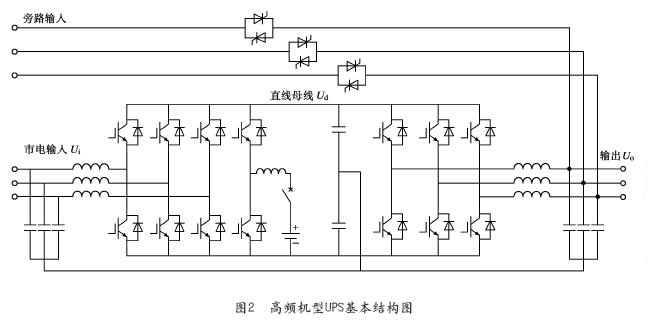 式中Ui為輸入線電壓的有效值。根據(jù)式(2),當(dāng)UPS輸入線電壓為380V時(shí),直流母線電壓不會(huì)超過513V,這樣UPS的輸出不能達(dá)到380V,必須通過變壓器升壓才能滿足要求。在中、大功率場(chǎng)合,高頻機(jī)的主電路由IGBT整流器、充電器和IGBT逆變器構(gòu)成,如圖2所示。整流器和逆變器的開關(guān)管均為IGBT,工作頻率在10kHz以上,因此這種結(jié)構(gòu)的UPS被稱為高頻機(jī)。由于高頻機(jī)整流器采用PWM整流技術(shù)屬于升壓整流,UPS輸出電壓可以滿足負(fù)載要求,因此輸出無需配備升壓變壓器。