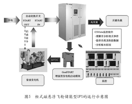 在傳統(tǒng)UPS供電系統(tǒng)中,當(dāng)電力發(fā)生中斷時(shí),蓄電池會(huì)支撐系統(tǒng)正常運(yùn)轉(zhuǎn),與此同時(shí),柴油發(fā)動(dòng)機(jī)開始啟動(dòng),以此保證數(shù)據(jù)中心主機(jī)正常工作、空調(diào)連續(xù)運(yùn)轉(zhuǎn)。蓄電池型UPS在此過程中,提供了“分鐘級(jí)”的電力供電。而飛輪儲(chǔ)能型UPS受制于機(jī)械儲(chǔ)能,僅僅能夠提供30s到1min電力供電,這也是飛輪UPS被詬病的主要原因。然而,專家指出,如今,市電電源的可靠性達(dá)到99.9%,有些重要的負(fù)載都采用雙路市電供電,市電的可靠性可以說已經(jīng)達(dá)到了99.99%。萬一市電中斷,后備電源的可靠性也可以達(dá)到99.9%,從市電到后備電源的切換,在技術(shù)上只需要10s的時(shí)間,這是一個(gè)公開的標(biāo)準(zhǔn)。目前,歐洲可做到8s。可以斷定,飛輪儲(chǔ)能型UPS能提供30s的電力完全能夠滿足從市電到后備電源的可靠切換的要求。圖3給出了柜式磁懸浮飛輪儲(chǔ)能型UPS的運(yùn)行示意圖。