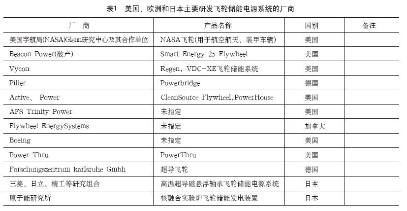 表1給出了美國(guó)、西歐和日本幾個(gè)著名的飛輪儲(chǔ)能電源系統(tǒng)的廠商。