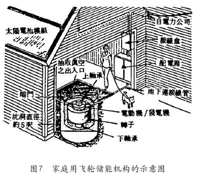 對(duì)于普通家庭,儲(chǔ)能式飛輪也有廣闊的應(yīng)用前景。家庭用電系統(tǒng)可以采用電力公司供電、太陽能電池組、風(fēng)力發(fā)電機(jī)組及微型汽油發(fā)電機(jī)來保障家庭的電源的不間斷供應(yīng)。而平時(shí)多余的太陽能和風(fēng)能首先可以給后備的飛輪儲(chǔ)能機(jī)構(gòu)以及電池組充電,其次也可以用來給室內(nèi)加熱取暖,再次可以通過逆變器給電網(wǎng)反饋,并取得收益。圖7為家庭用飛輪輪能機(jī)構(gòu)的示意圖。