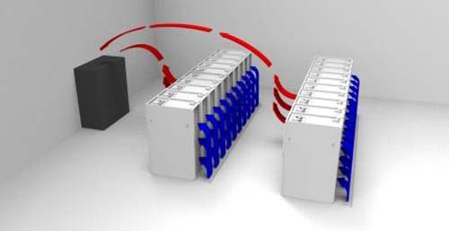 針對此種情況,在出風(fēng)口安裝主動出風(fēng)裝置—ADU,ADU上裝有兩個或四個EC風(fēng)機,風(fēng)機可以根據(jù)機柜的負載情況進行轉(zhuǎn)速調(diào)速。通過這種主動送風(fēng)裝置,可以提高空調(diào)送風(fēng)效率,這樣就可以在滿足制冷量及風(fēng)量的需求情況下,減少空調(diào)開機的臺數(shù),達到節(jié)能的效果。