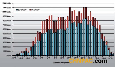 E2V的高效調(diào)理性和適應(yīng)能力意味著空調(diào)體系能夠運(yùn)轉(zhuǎn)在最大功率下。當(dāng)室外溫度合當(dāng)令(夜間或冬秋季月份),可將冷凝壓力下降至10bar,從而下降了耗電量。另一方面,機(jī)械式熱力脹大閥總是強(qiáng)制機(jī)組運(yùn)轉(zhuǎn)在冷凝壓力超越17bar的情況下。在較熱的氣候情況下,電子脹大閥的長處是能夠更好地利用蒸騰器;在較冷的氣候下,其能夠下降機(jī)組的運(yùn)轉(zhuǎn)壓力,從而下降耗電量,進(jìn)步功率。