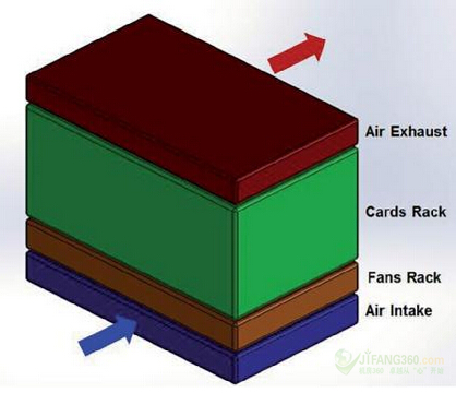 冷卻系統(tǒng)的組織,是為了使其符合機架供應(yīng)商的標準。如圖1所示,其顯示了我們最終的設(shè)計草圖。進氣口是在前端的底部,而空氣的排出口是在頂部的背面或頂部。空氣流是從機架的底部流到頂部。最小空氣流量為每秒0.2立方米(m3/s)或420立方英尺每分鐘(cfm)。這一空氣流被定義了,以便該系統(tǒng)將能夠與現(xiàn)有的卡和機架向后兼容。機架的大小被固定在大約0.4 m x 0.44 m x 0.25 m (H x W x D),這意味著系統(tǒng)中的空氣每秒將被替換約四次。