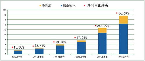 網(wǎng)宿2010-2015年半年報收入增長圖